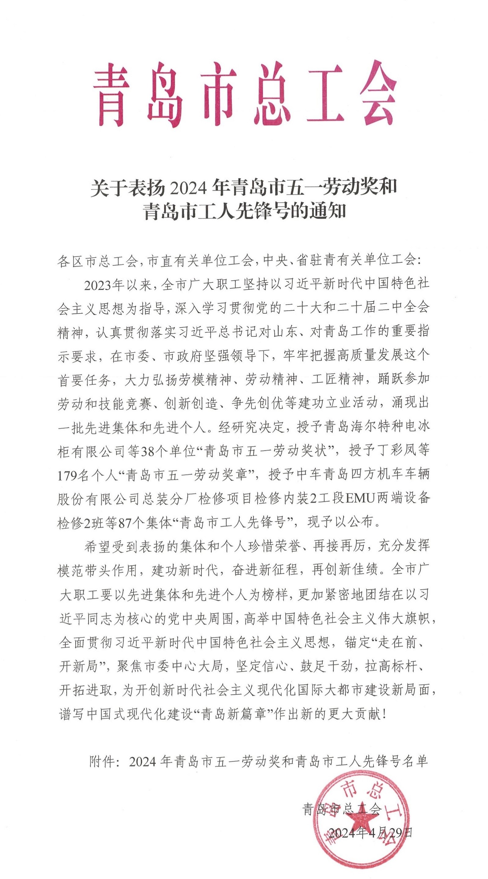 为学习先进、树立榜样,大力弘扬劳模精神、劳动精神、工匠精神,营造劳动光荣的社会风尚和精益求精的敬业风气,“五一”前夕,青岛市总工会公布2024年青岛市五一劳动奖和青岛市工人先锋号的通知,授予青岛思普润水处理股份有限公司等38个单位“青岛市五一劳动奖状”。