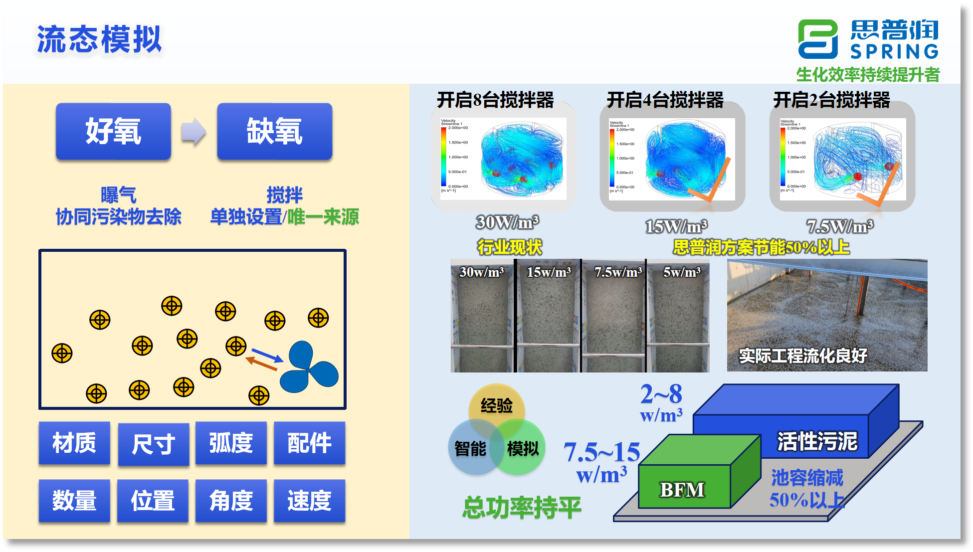 基于生物膜工艺流态模拟平台,思普润在确保载体均匀流化的情况下,将缺氧区流化能耗从行业30W/m³降至7.5W/m³,降幅达到75%,同步提升设备寿命,支撑BFM工艺全球领先优势。