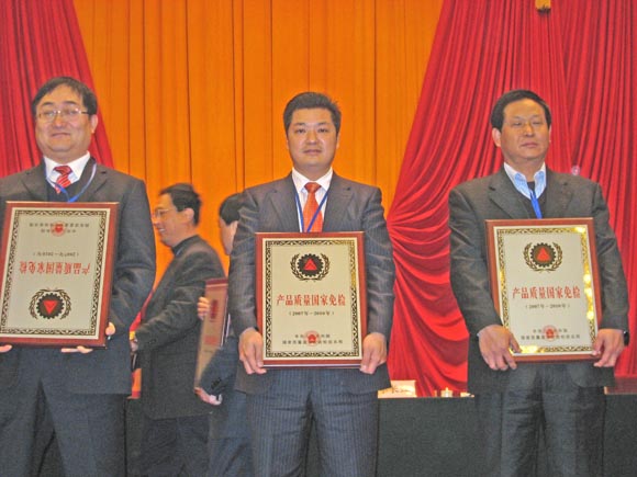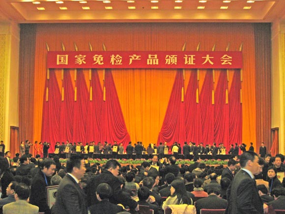 2007年12月14日,國家質(zhì)量監(jiān)督檢驗(yàn)檢疫總局,在北京人民大會(huì)堂隆重舉行了“國家免檢產(chǎn)品頒布大會(huì)”國家總局李長江局長親自為我司頒獎(jiǎng)。