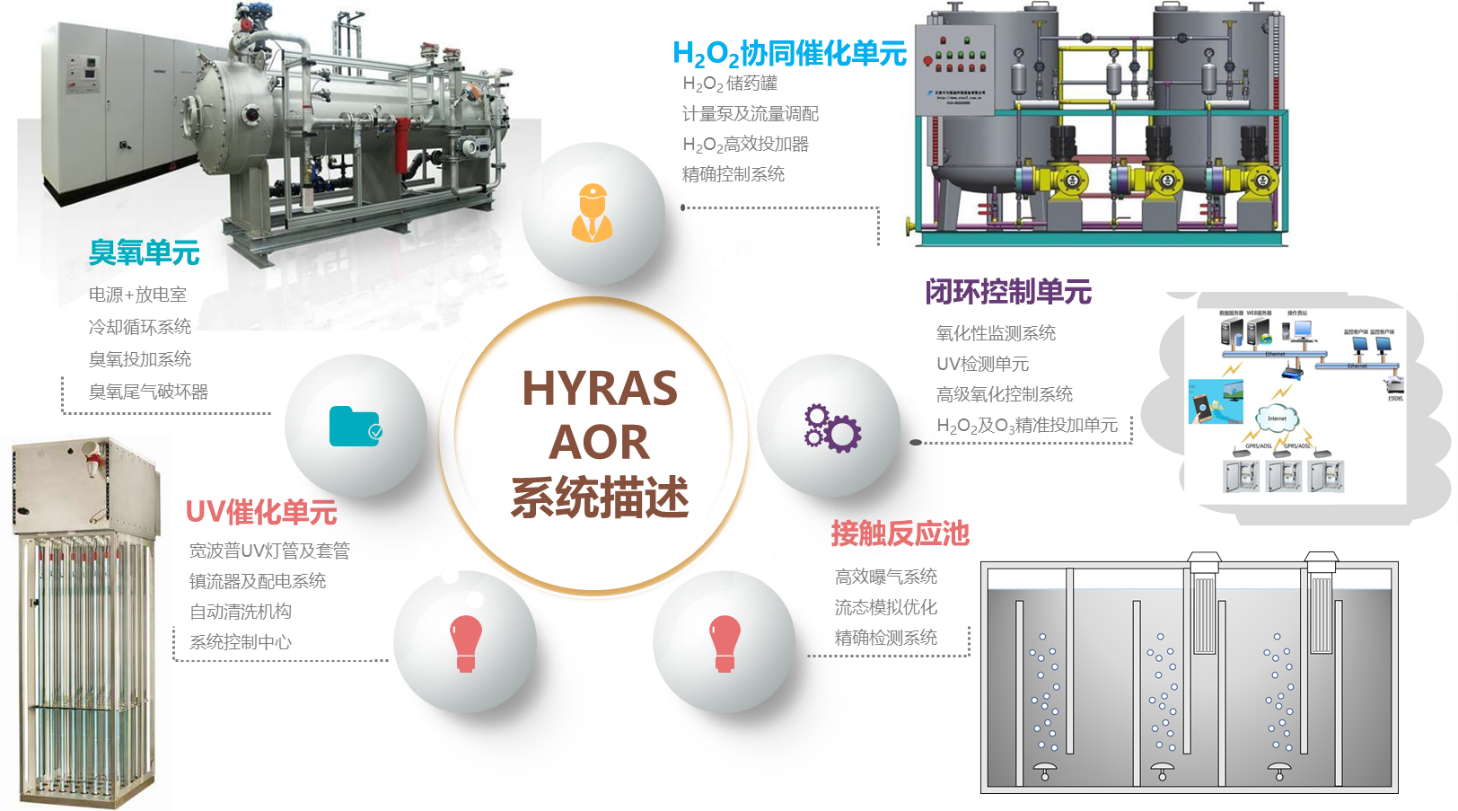 O3/H2O2/UV系统主要由接触反应池、臭氧单元、UV催化单元、H2O2协同催化单元、闭环控制单元五部分组成。