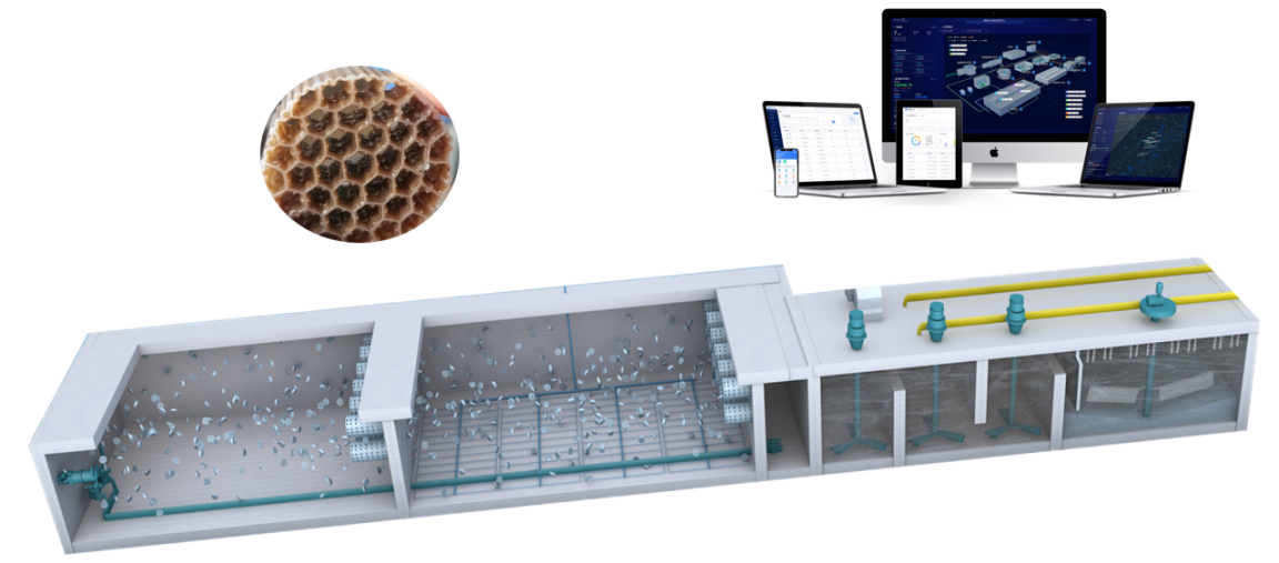 BFM生物集效工艺是集生物膜生化处理与强化固液分离于一体的完整工艺系统,可对来水中污染物实现全指标稳定达标,工艺构筑物分为生物膜反应区与强化固液分离区,且耦合大数据智慧控制系统。